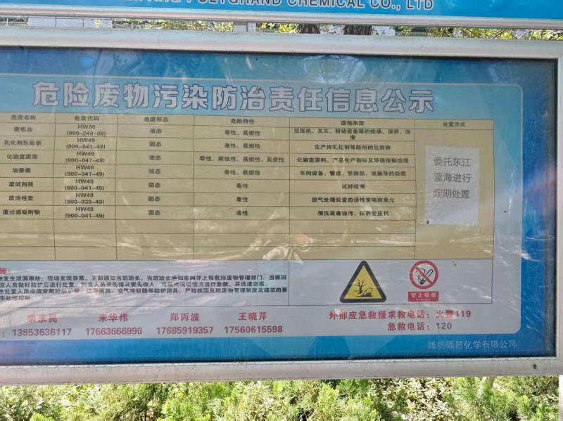 我濰坊碩邑化學有限公司現(xiàn)有危險廢物八種,分別為廢活性炭(HW49 900-039-49)、乳化劑等助劑包裝物(HW49 900-041-49)、油漆桶(HW49 900-041-49)、廢試劑瓶(HW49 900-041-49)、化驗室廢液(HW49 900-047-49)、廢機油桶(HW08 900-249-08)、廢機油(HW08 900-214-08)、廢過濾吸附物(HW49 900-041-49)。